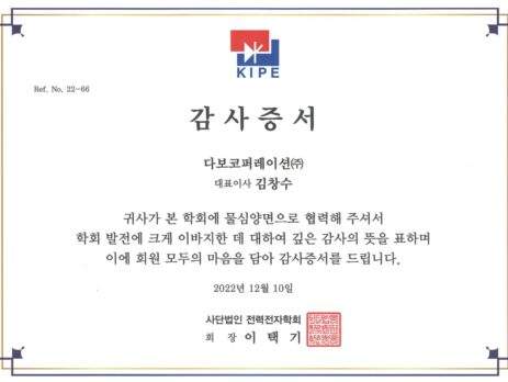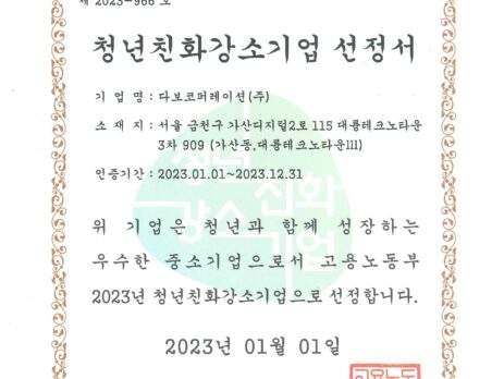 2023년 청년친화 강소기업 선정서 Certificated of Youth-friendly Small Giants 2023 (From Ministry of Employment and Labor in Korea)